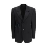 Balenciaga Barathea villane rätsepalõikega jakk tõlgendab klassikalist rätsepatööd kaasaegses ja viimistletud võtmes. Kvaliteetsest villast valmistatud ning kompaktse käetundega mudelil on klassikaline krae ja reväärid ning puhas üherealine esikinnis, mis loob elegantse silueti. Pikad varrukad reguleeritavate nööbitavate mansettidega, rinnatasku ja klappidega pealeõmmeldud taskud järgivad traditsioonilisi rätsepatöö koode, samal ajal kui vöökohal olev pingutusnöör lisab modernse ja funktsionaalse nüansi, võimaldades sobivust kohandada.