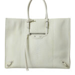 Balenciaga PAPIER A4 Classic Studs shopper-kott on valmistatud püütoninahast. Mudelil on kaks peenikest rullitud käepidet, ees lukuga tasku, needid ja pandladetailid ning hõbedatooni metallosad.