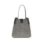 Balmain Release Bucket Bag on jakaar- ja nahadetailidega õlakott. Mudelil on õlarihm ja käepide ning trukkkinnitus; tugevdatud küljed aitavad hoida kuju.