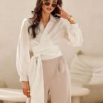 Roco Fashion lühike pluus krae ja reväärkaelusega, vööl seotava paelaga ning pikkade puhvvarrukatega. Lõige on cropped-pikkusega.