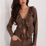 Italy Moda naiste pluus on elegantse stiiliga ja minimalistliku üldmuljega. Mudelil on lühike pikkus, pikad varrukad, lipsuga seotav kaelus ning ees volangid.