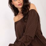 Italy Moda naiste pluus on elegantne valik pidulikumateks sündmusteks ja pidudeks. Mudel on valmistatud viskoosist ning kogu materjali pind on kaunistatud peene jet-kivide aplikatsiooniga; pikkade varrukatega mudelil on varrukatel õrn rüüs ja õlgadelt paljastatud kaelus.