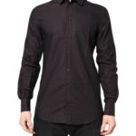 Dolce & Gabbana triiksärk, mudel Gold shirt, on bordoo värvi täpilise mustriga ning klassikalise krae ja pikkade varrukatega.