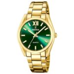Festina naiste käekell F20640/9 on stiilne ja naiselik aksessuaar rohelise sihverplaadiga. Kuldse roostevabast terasest rihma ja korpusega moodustab see modernse, kuid samas ajatu kombinatsiooni.