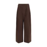 Viimistletud detailid ja luksuslik hoiak. Ganni pruunid püksid on ruudulise trüki ja eest üle mineva detailiga.