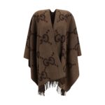 Gucci keebimantel on kahtepidi kantava disainiga, sallkraega, narmastatud äärega, ikoonilise üleüldise kontrastse brändilogoga ja oversized-lõikega.