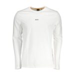 Hugo Boss T-särk on valge ja pika varrukaga ning ümara kaelusega. Mudelil on BOSS logo.