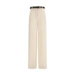 Max Mara püksid on elegantse ja struktureeritud rätsepatööga. Helkivas elevandiluu toonis mudelil on laiad sääred, kõrge värvel ning tõmbluku, liistu ja konkskinnitusega sulgemine; lisaks küljetaskud ja tagumised kahekordse kandiga taskud nööbiga ning sobiv nahast vöö ümmarguse pandlaga.