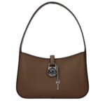 Viimistletud detailid ja luksuslik hoiak. Michael Kors pruun käekott esiküljel olevate detailide ja logoga.