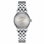 Ajatu disain ja viimistletud detailid luksuslikus võtmes. Mido hall naiste käekell automaatikaga valge sihverplaadi ja safiirklaasiga.
