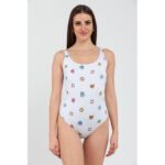 Moschino valge ühes tükis ujumistrikoo on fantaasiamustriga.