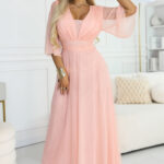 Ajatu valik pidulikeks hetkedeks ja eriliseks stiiliks. Numoco Basic virsikukarva pikk pluss-suuruses kleit 654-4 ümberkinnitusega V-kaelusega.