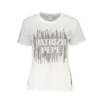 Patrizia Pepe lühikeste varrukatega ümara kaelusega T-särk kontrastsete detailide ja brändilogoga toonis Bianco.