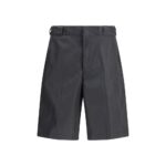 Prada Re-Nylon bermuudapükstel on puhas siluett, samast kangast vöökoht, varjatud lukk ja haagiga kinnitus, ees kaldu taskud ning taga nööpidega kanditud taskud; küljel on emailitud metallist kolmnurkne logo.