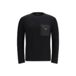 Prada pusa on lihtne, kuid viimistletud rõivaese, valmistatud puhtast värskest villast, et tagada mugavus ja soojus. Metallist kolmnurkne logo rinnal lisab eristuva detaili. Ümar kaelus, soonikkoes kätised ja alläär täiendavad disaini klassikaliste ja funktsionaalsete viimistlustega. Rinnatasku täiendab üldmuljet, muutes pusa elegantseks ning praktiliseks ja modernseks.