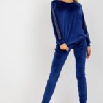 Set Relevance veluurkomplekt, mis koosneb pluusist ja pikkadest pükstest. Pluusil on pikad varrukad ja ümar kaelus ning pükstel on vöökohal seotav pael ja külgedel taskud; varrukad on kaunistatud kivikeste mustriga.