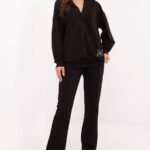 Set naiste komplekt mudel 206589 koosneb pikkade varrukatega pluusist ja pükstest. Pluusil on mähkiv dekoltee ning tagasihoidlik embleem; pükstel on sirge lõige, kõrge vöökoht, lai elastne vöökoht ja küljetaskud.