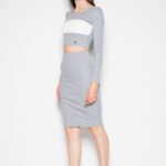 Viimistletud kooslus selge joone ja stiilse hoiakuga. Venaton kontrastset värvi dekoratiivse vööga pikkade varrukatega lühike pluus ja pliiatsseelik.