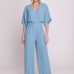 Stylove kombinesoon on stiilne ja elegantne naiste mudel, mis ühendab mugavuse naiseliku lõikega. Ülaosa on mähkimisstiilis ja õrnade voltidega, V-kaelus rõhutab kaelajoont; lühikesed varrukad ning kergelt laienevad püksisääred loovad harmoonilise proportsiooni, küljetaskud lisavad praktilisust. Mudel kinnitub seljal peidetud lukuga ning on disainitud ja valmistatud Poolas.