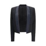 Tom Ford must jakk on lühikese lõikega ja eest lahtise disainiga. Jakil on lai kahetooniline šallkrae, struktureeritud õlad, küljetaskud kanditud servaga, täisvooder ja standardne lõige.