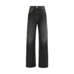 Versace sirge lõikega teksapüksid, millel on neetidega detailid, ühendavad klassikalise denimi ikooniliste brändidetailidega, nagu Medusa-nööp ja nahast logoga aplikatsioon. Neetide ja kristallidega kaunistatud mudelil on rock-chic nüanss. Viie taskuga stiil ning nööbi- ja lukukinnitus täiendavad praktilist ja stiilset disaini.
