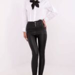 Women naiste skinny kunstnahast püksid mudel 211187. Mudelil on kõrge vöökoht, kitsenevad sääred, dekoratiivsed nööbid esiküljel ning avatud küljetaskud; klassikaline kinnitus puudub.